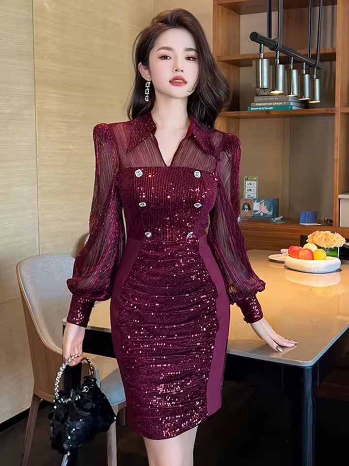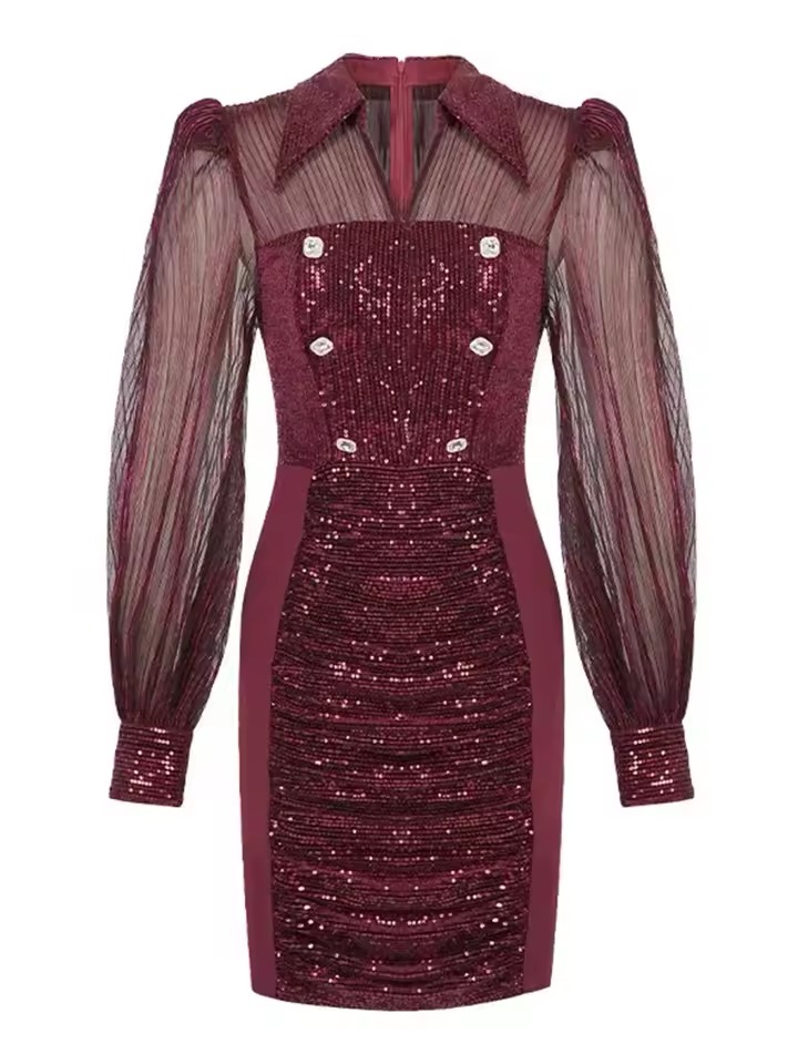 Elegant Lantern Long Sleeve Solid Retro Sequins Lapel Pencil Mini Dress