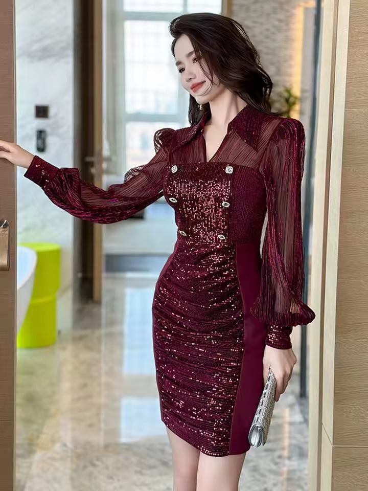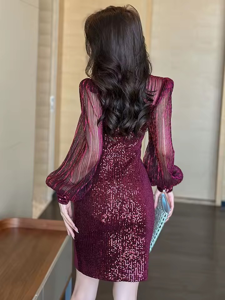 Be the first to review “Elegant Lantern Long Sleeve Solid Retro Sequins Lapel Pencil Mini Dress”
