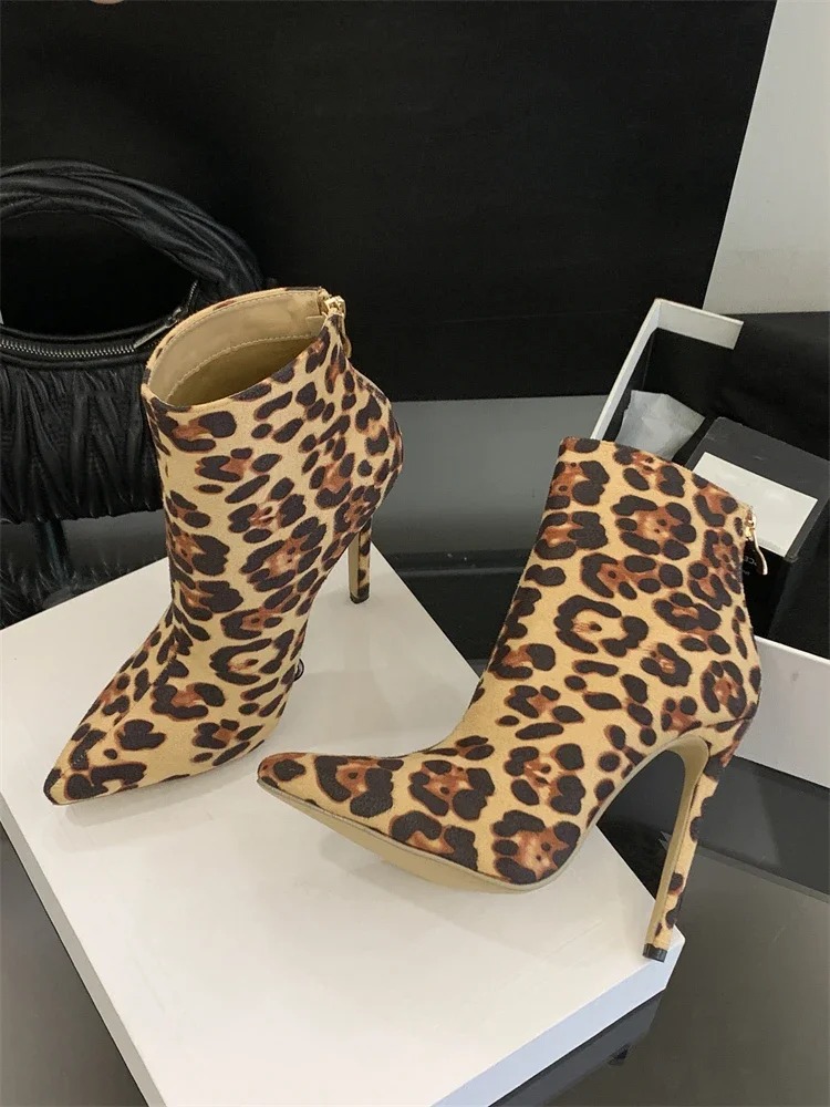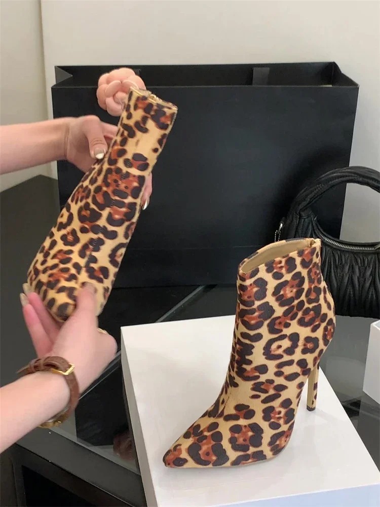 Elegant Leopard Print Pointed Toe Ankle Zipper Thin High Heels Boots