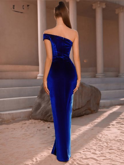 Be the first to review “Elegant Maxi Sexy High Split Blue Velvet One Shoulder Dress”
