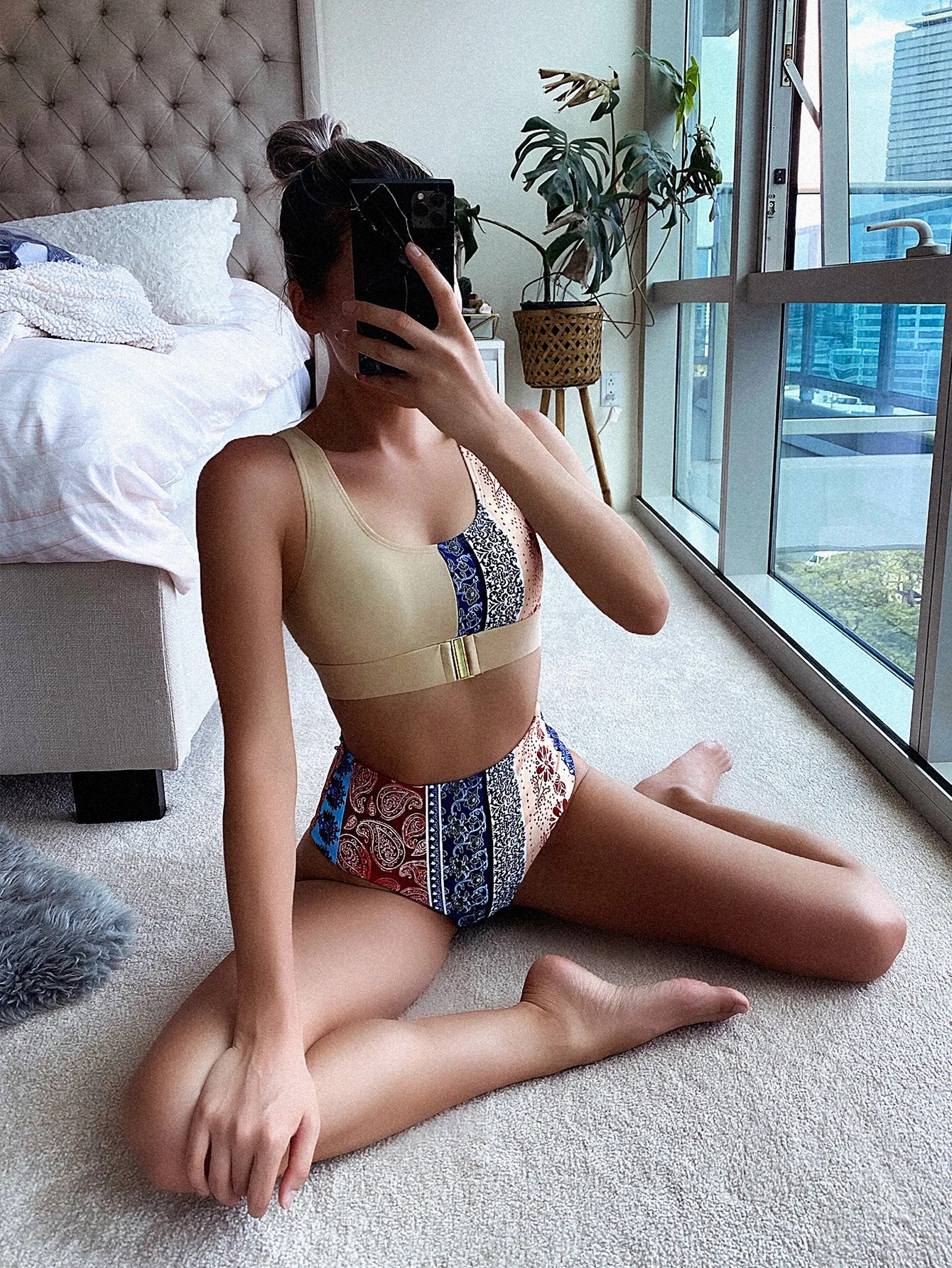 Elegant Push Up Patchwork Print Sports Bra Bathing Suit Metal Buckle Crop Tops
