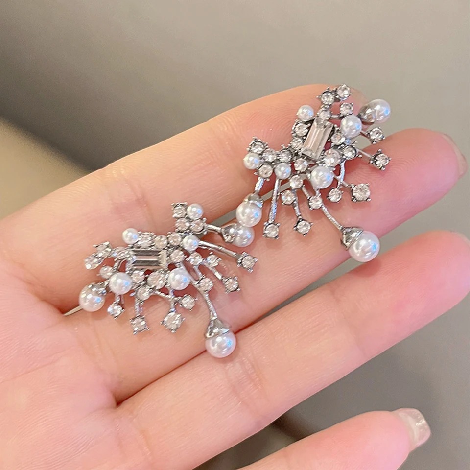 Elegant Romantic Bridal Aesthetic Irregular Rhinestone Pearl Flower Stud Earrings