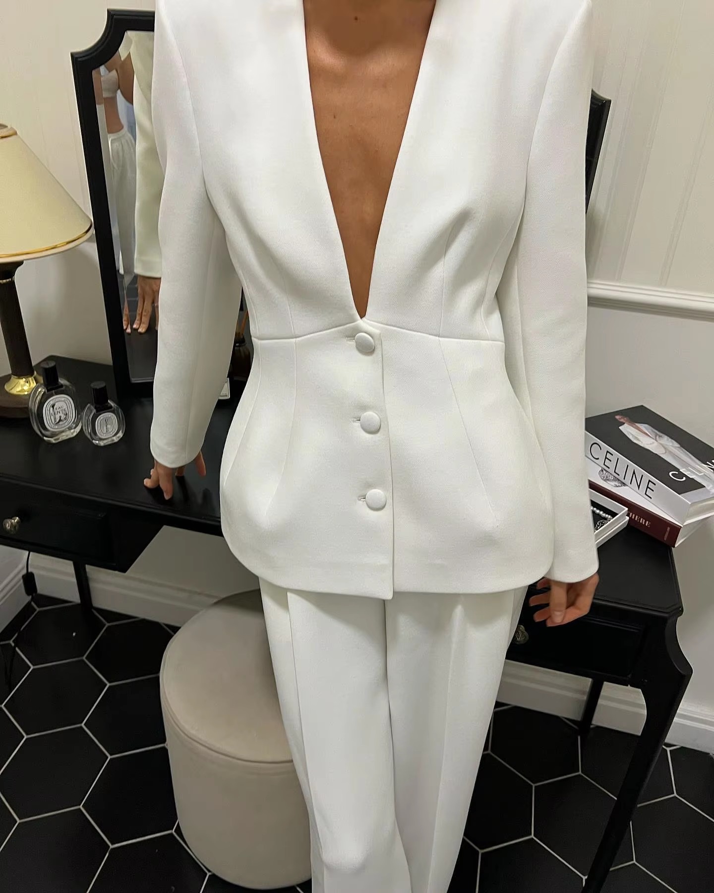 Elegant Solid Deep V-neck Single Breasted Blazer Coat High Waist Pants Chic Office Lady 2 Pieces Pants Suits