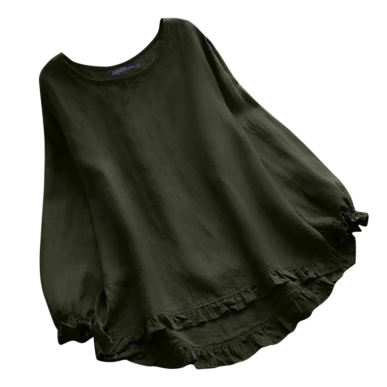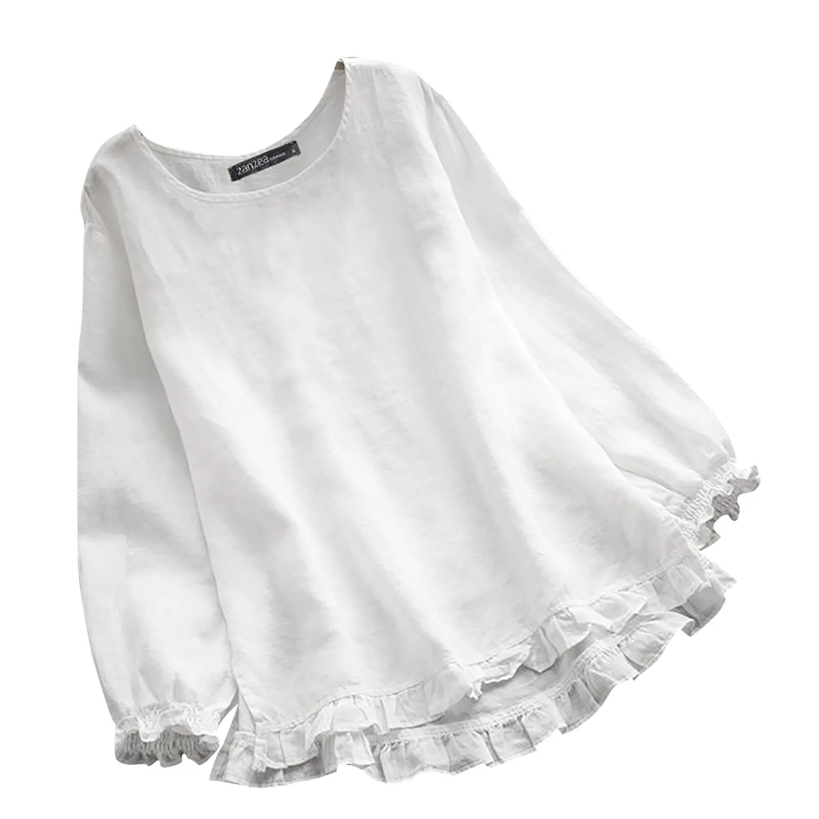 Elegant Solid Loose Ruffle Bottom Cuffs Crew Neck Long Sleeve Shirt