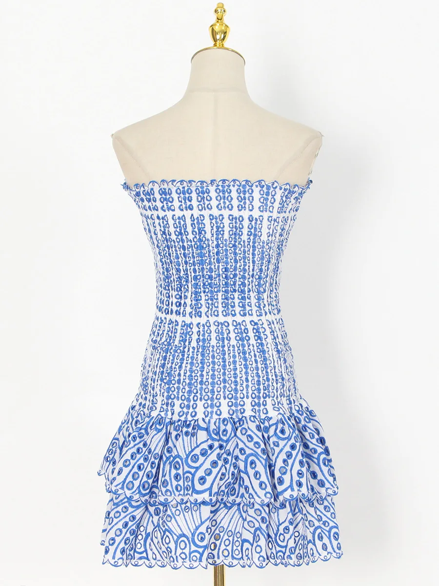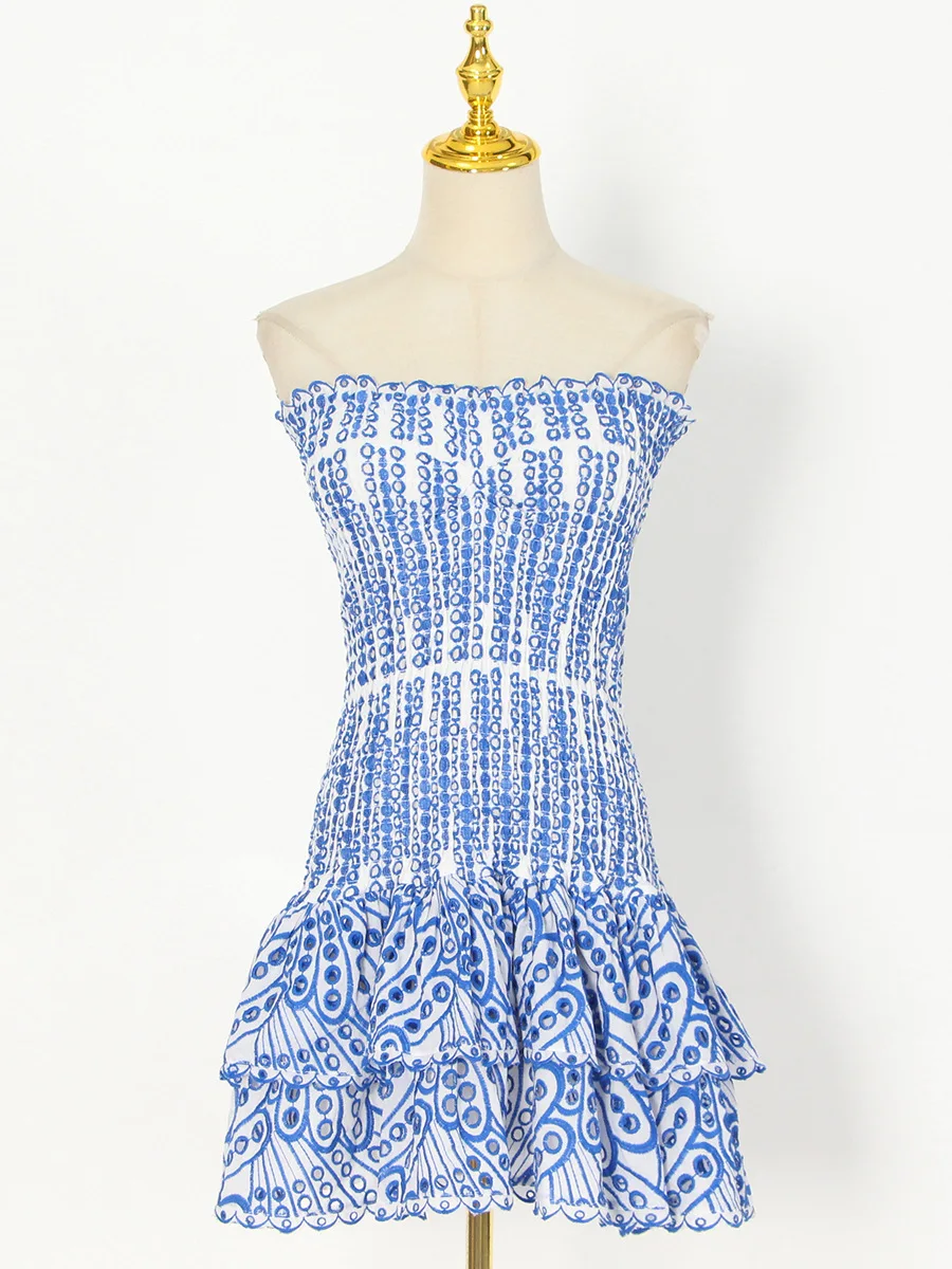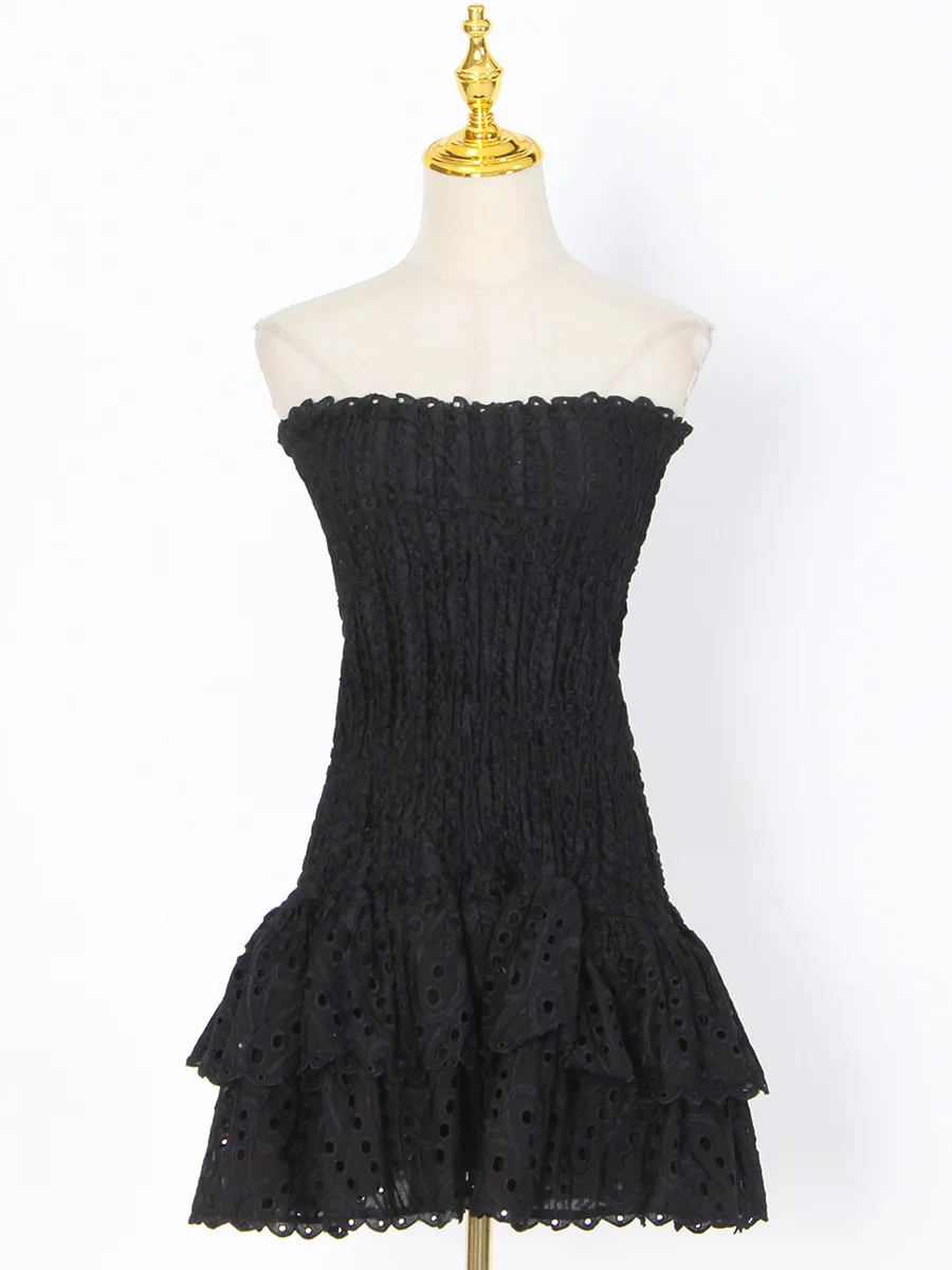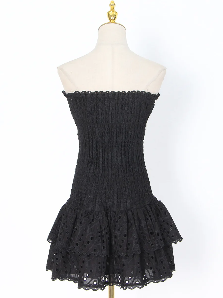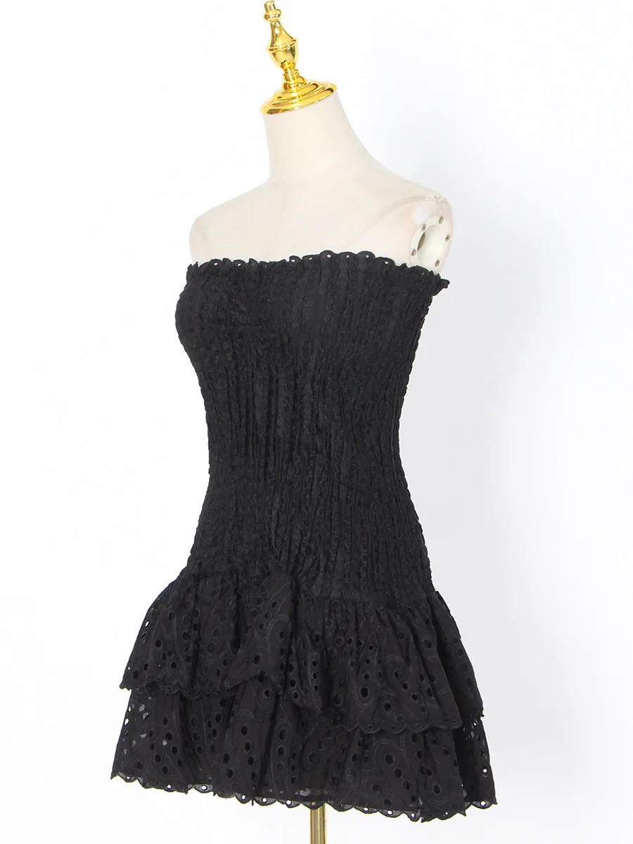Embroidery Cut Out Mini Dress Strapless Off Shoulder High Waist Slim Short Hollow Out Dresses