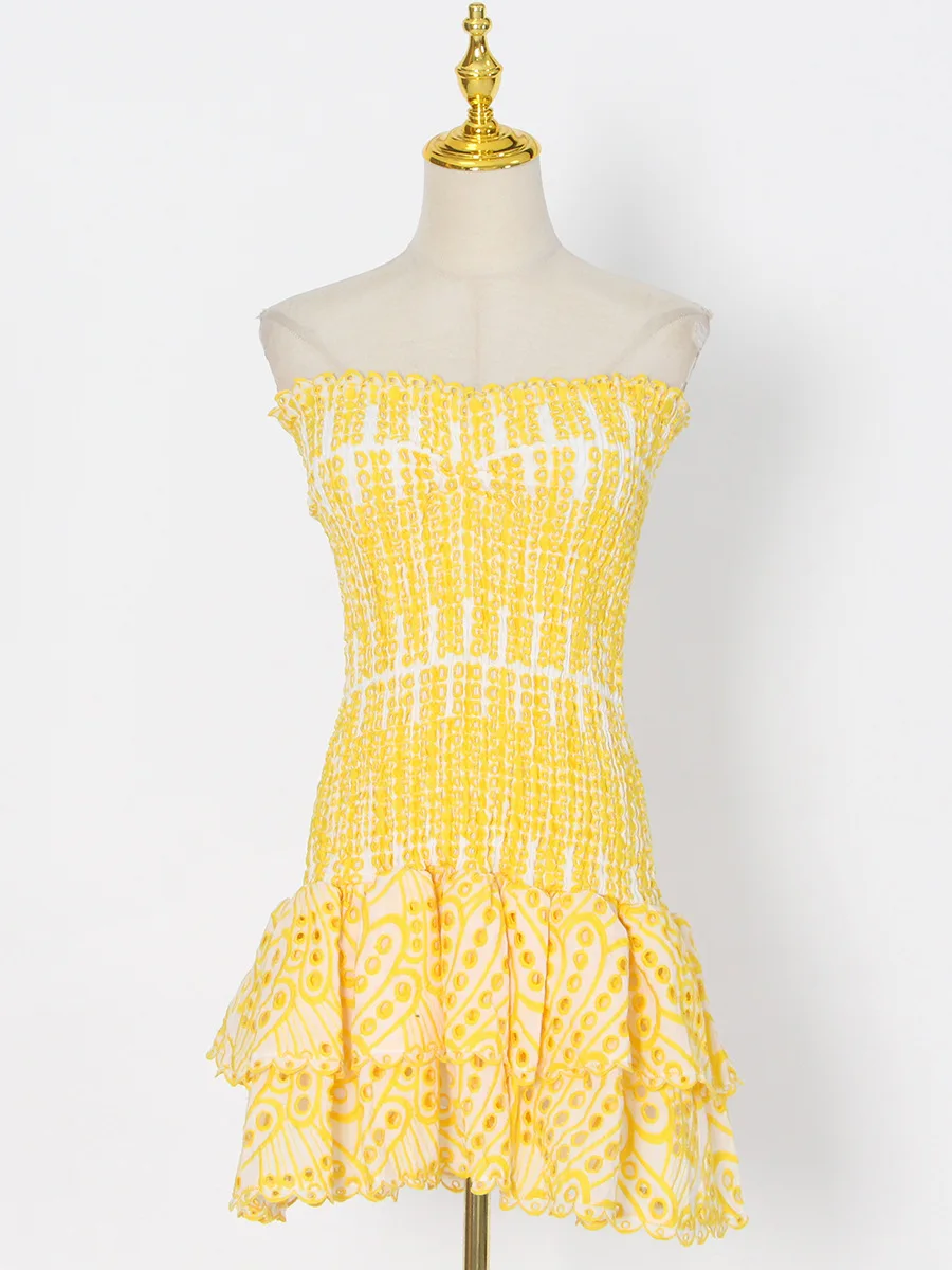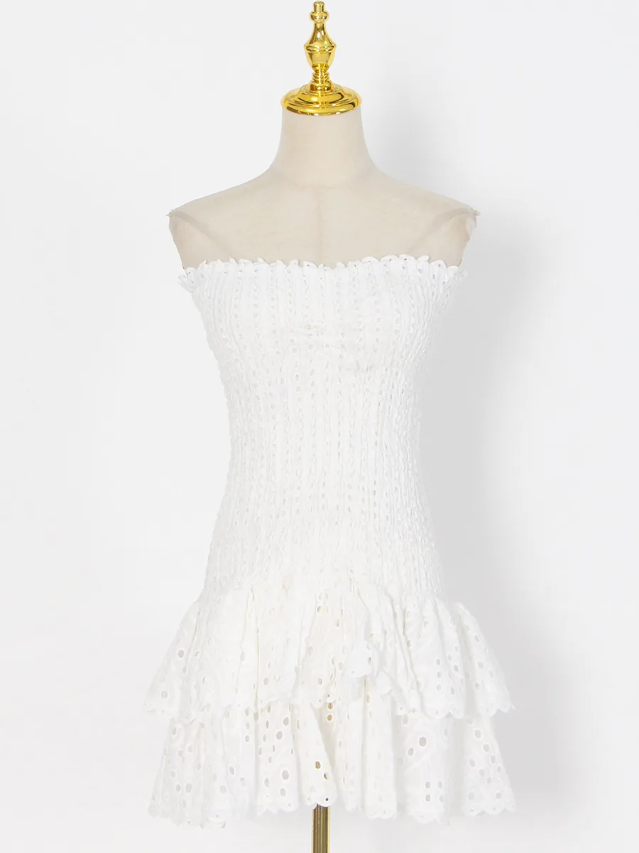 Embroidery Cut Out Mini Dress Strapless Off Shoulder High Waist  Slim Short Hollow Out Dresses
