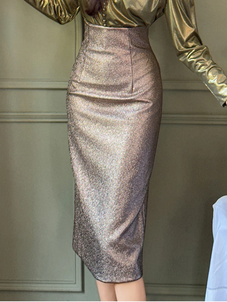Fashion Faux Leather PU Sparkly Glitter Slim Pencil Skirts Elegant Solid High Waist Wrap Hip Skirt Outfits Party Prom
