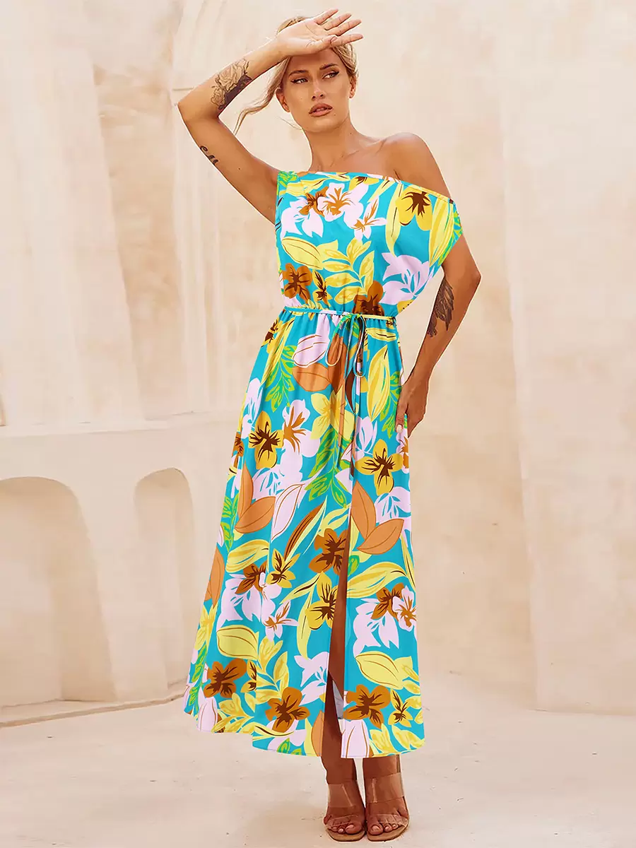 FASHION Printed Party Dress One Shoulder Belted Asymmetrical Midi Dress