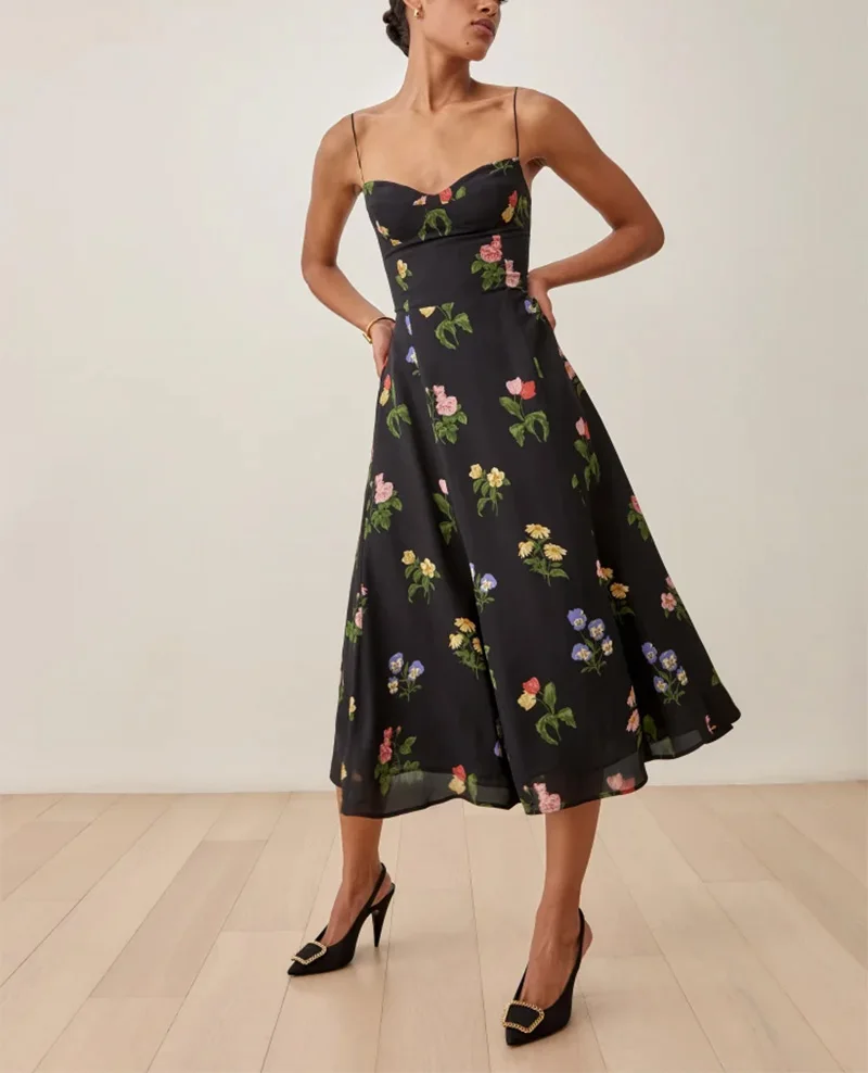 Be the first to review “Sweetheart Neck Spaghetti Strap Midi Dress Back Smocked Party Elegant Vintage Floral Print Dress”