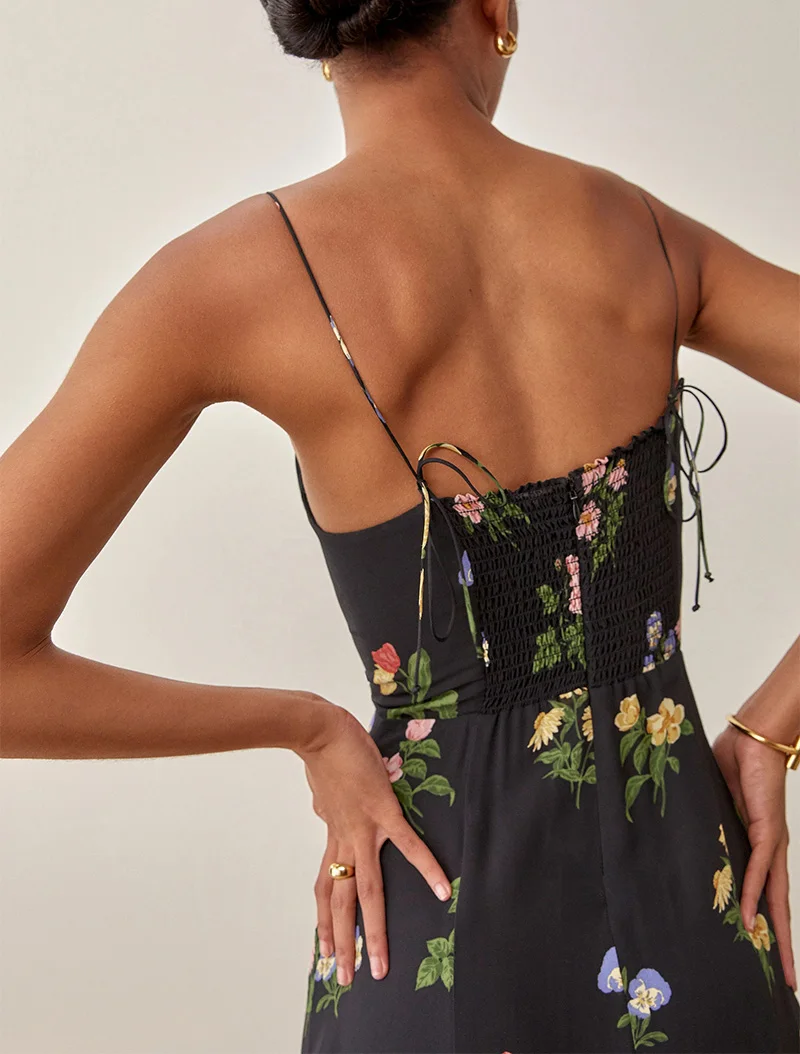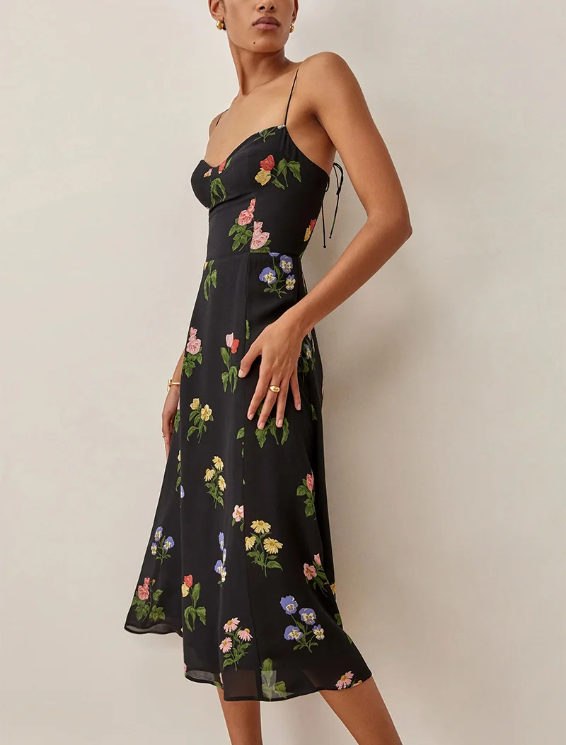 Sweetheart Neck Spaghetti Strap Midi Dress Back Smocked Party Elegant Vintage Floral Print Dress