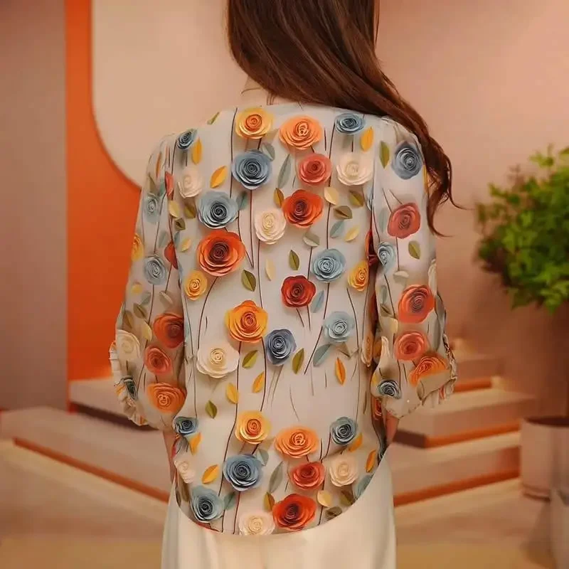 Floral Print V Neck 3/4 Sleeve Ruffled Loose Tops