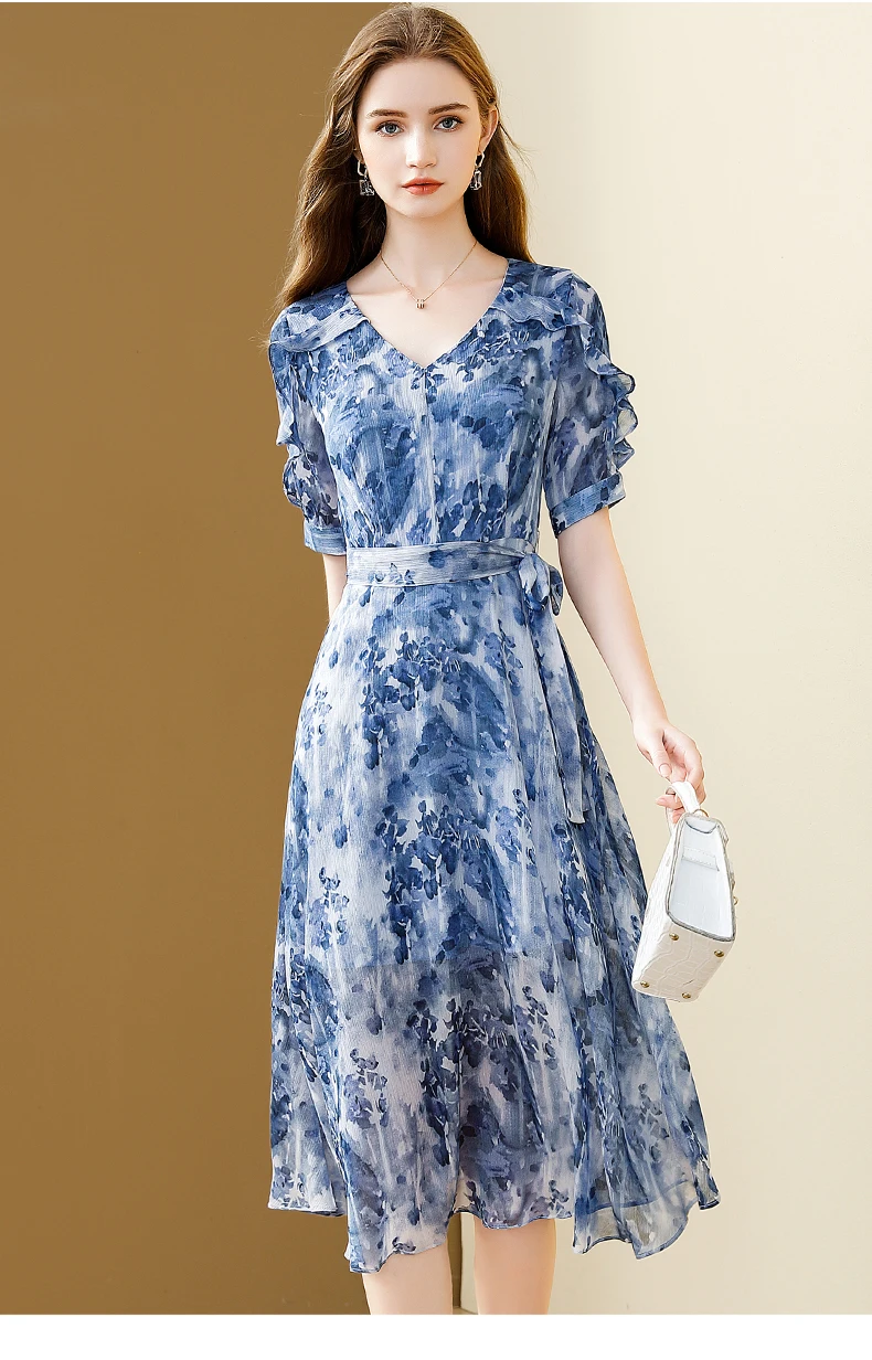 Floral Printing Chiffon Dress V-Neck Elegant Office A-line Party Slim Dresses Vestido