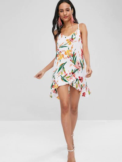 Accented with the bright, bold floral print throughout, this mini dress is crafted with the flirty cami silhouette and finished with a charming statement ruffle to create an uneven hem for a flowy, asymmetrical look. It’s a piece you’ll want to wear on repeat. Adjustable spaghetti straps.
