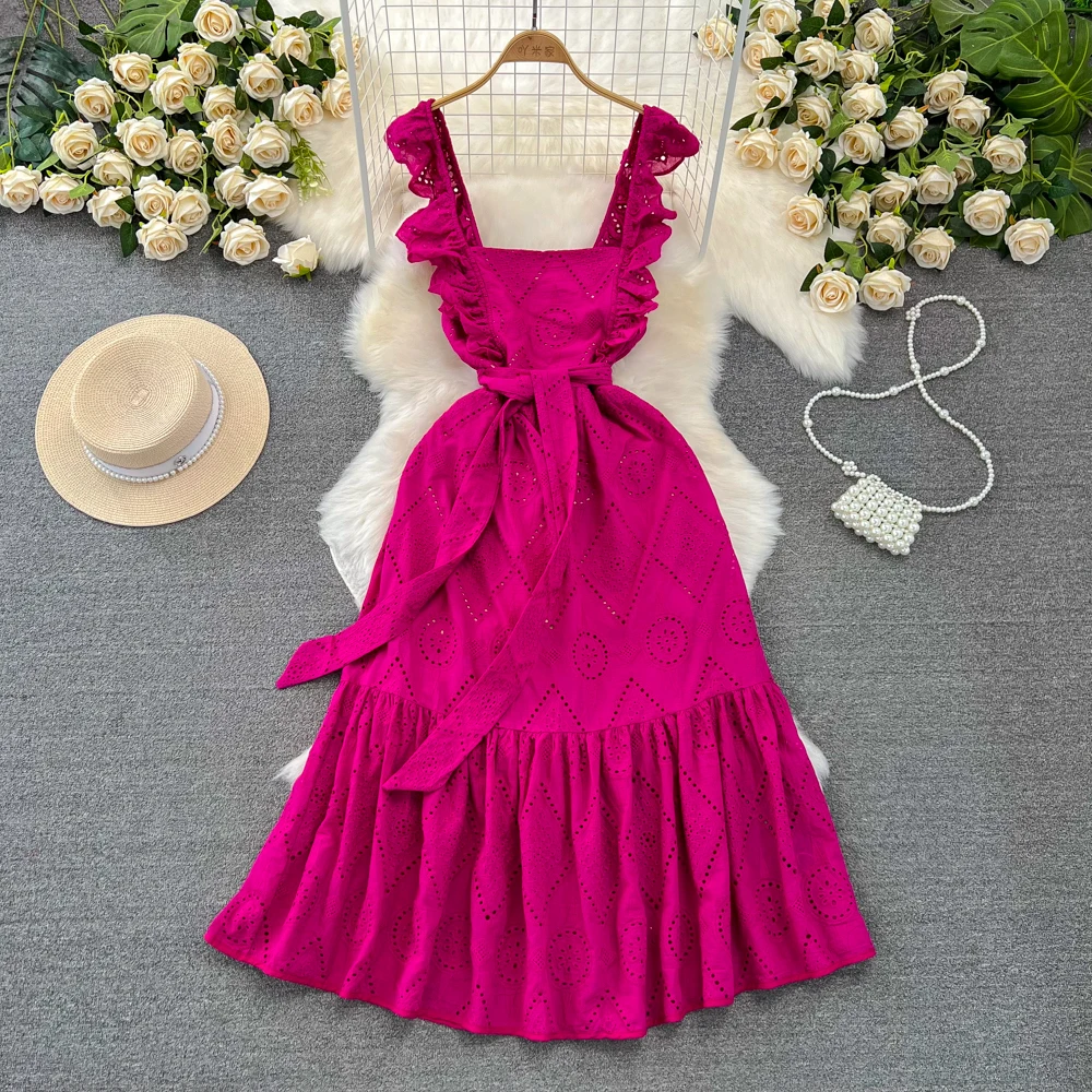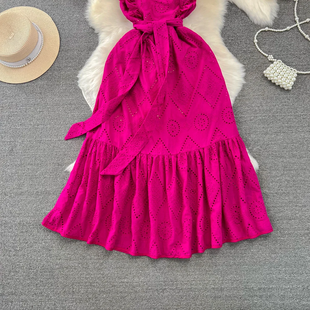 Flying Sleeve Crochet Hollow Out Dress for Women A-line Backless