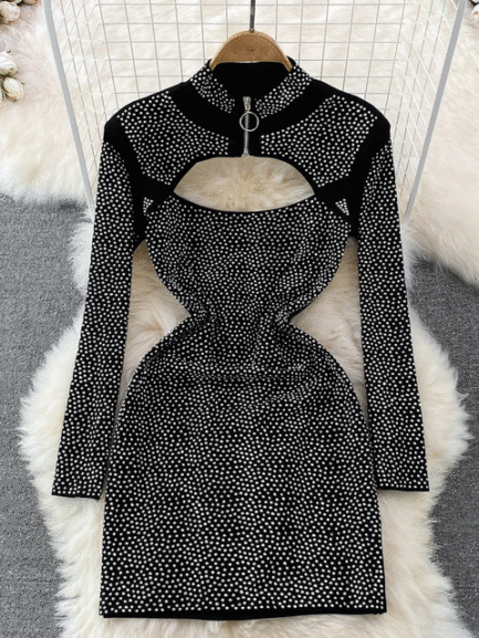 Half Stand Collar Long Sleeve High Waist Dress