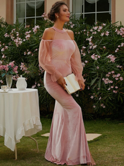 Halter Neck Mesh Sleeve Slim Mermaid Dress