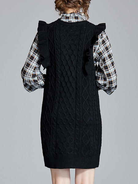 High Collar Plaid Ruffles Casual Long Sleeves Two Piece Sets