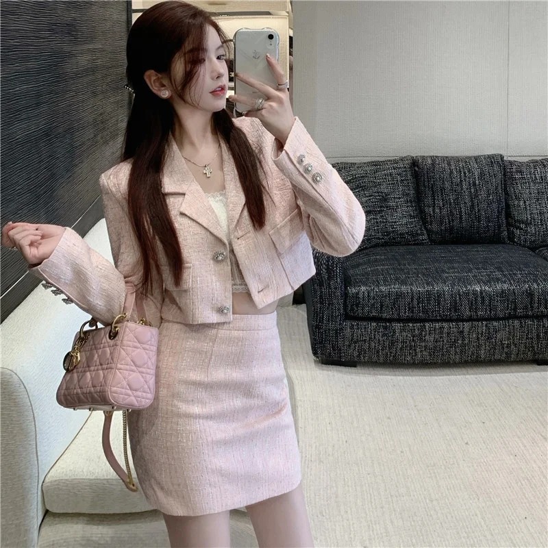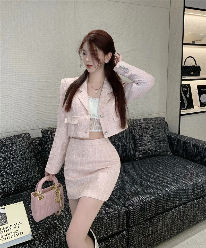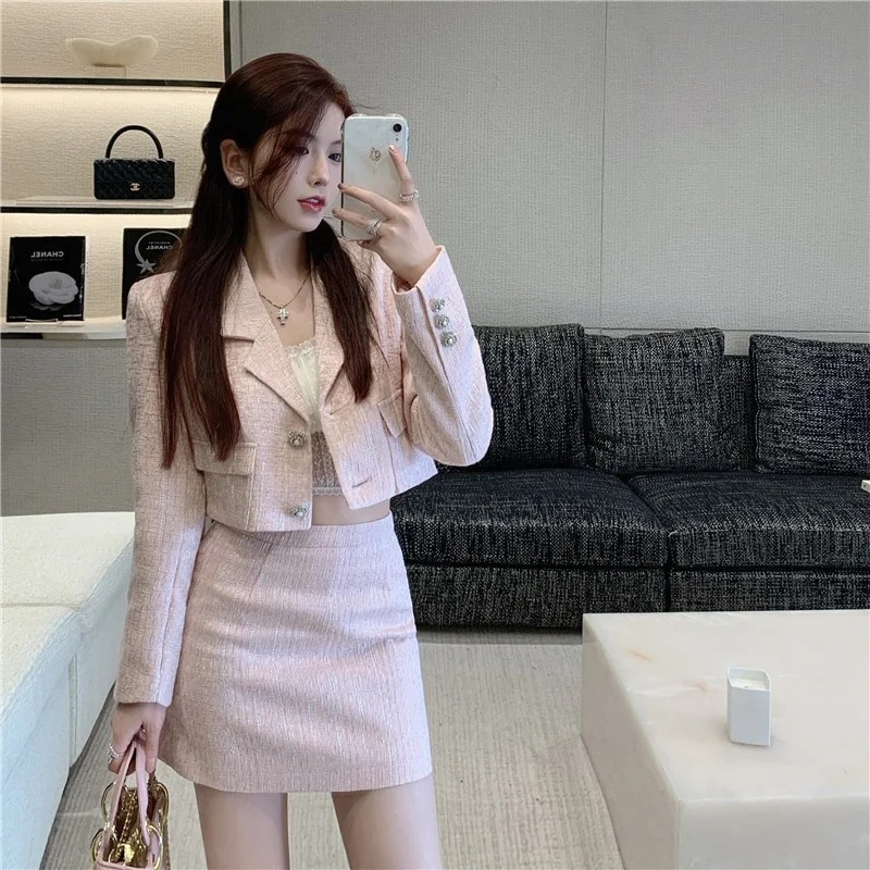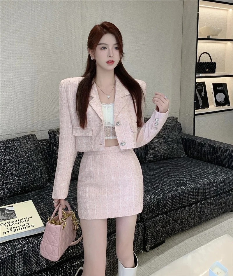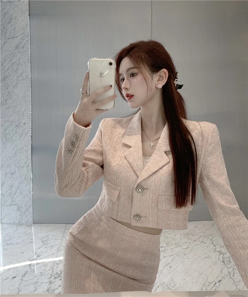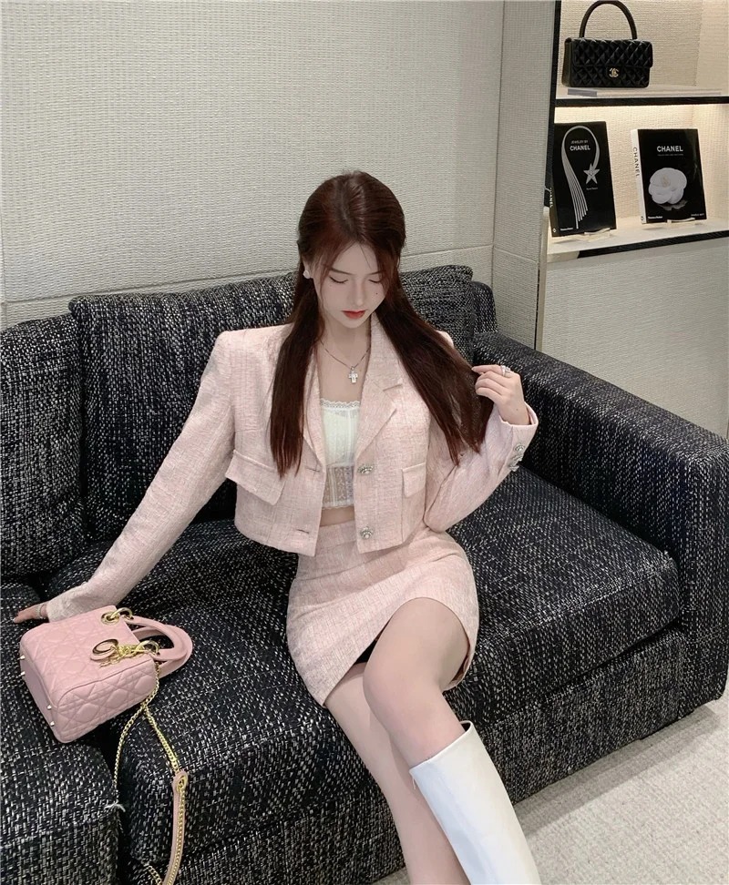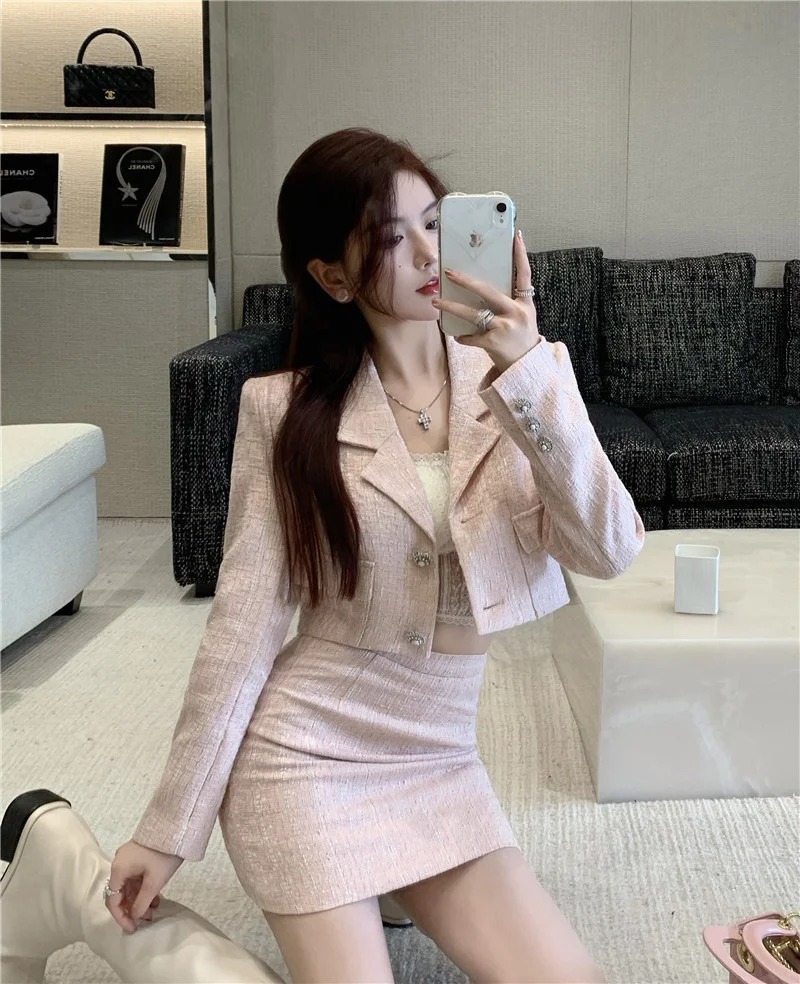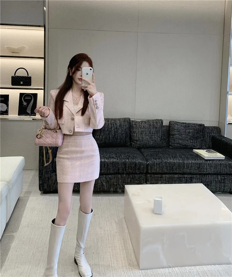 Be the first to review “High Quality Jacket Coat Crop Top And Bodycon Mini Skirt Tweed Two Piece Set”