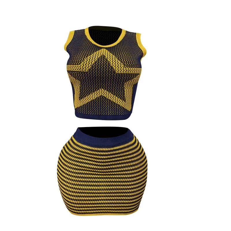 Knit Patchwork 2 Piece Sets Hipster Star Print Crop Tank Tops and Striped Mini Skirt