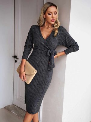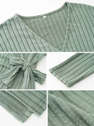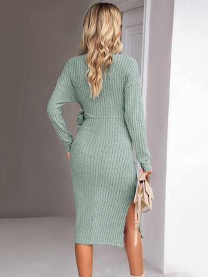 vKnitted Dress Lace Up Long Sleeves Low-slit V-Neck Dresses