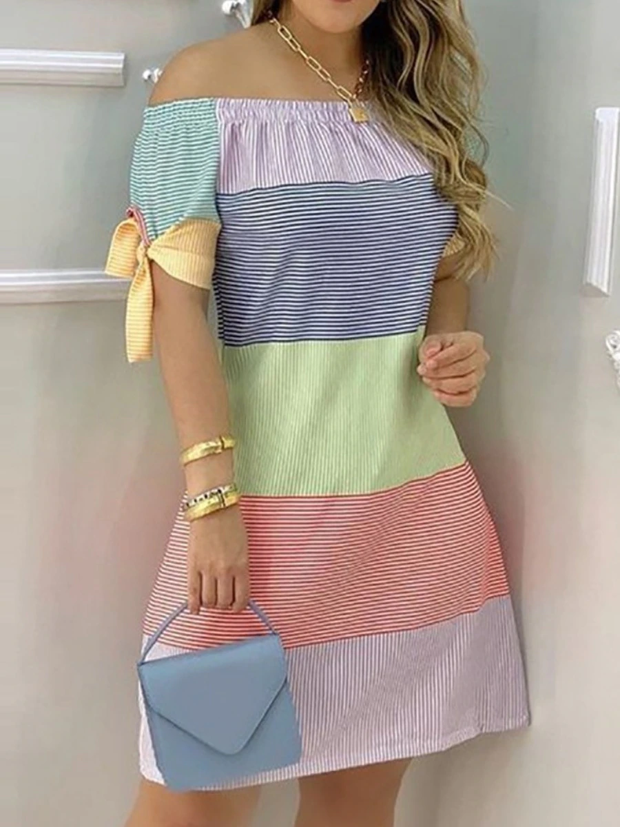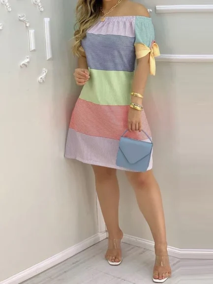 Be the first to review “Striped Print Color block Off Shoulder Casual Dress”