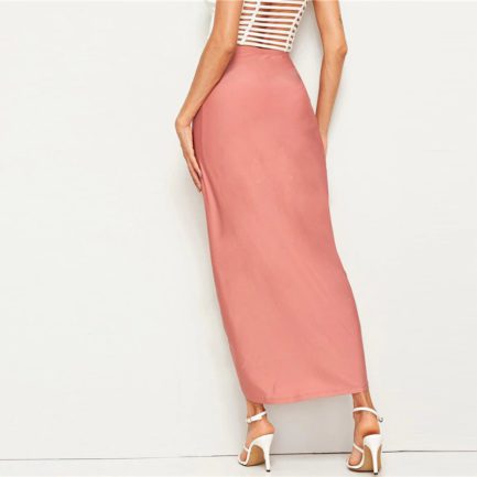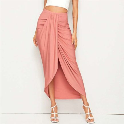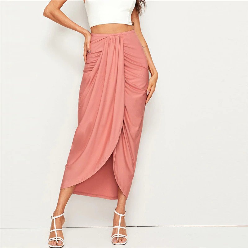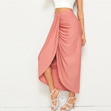 Ladies Pink Draped High Waist Skirt Solid Asymmetrical Wrap