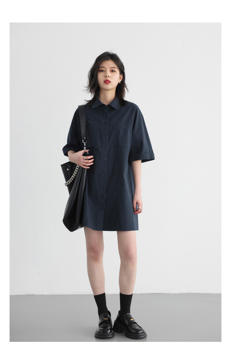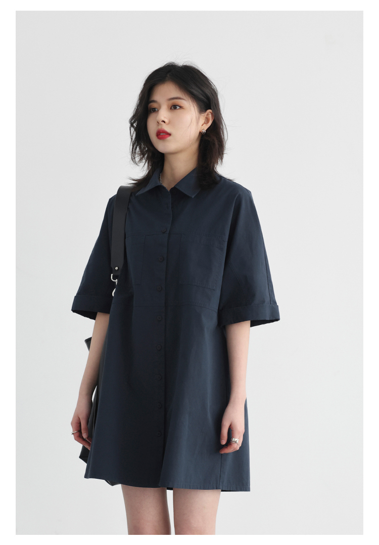 Solid Single Breasted Casual Loose Short Sleeve Shirt Dress