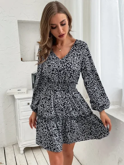Be the first to review “Elegant Long Sleeve V Neck Leopard Floral Print Pleated Mini Dress”