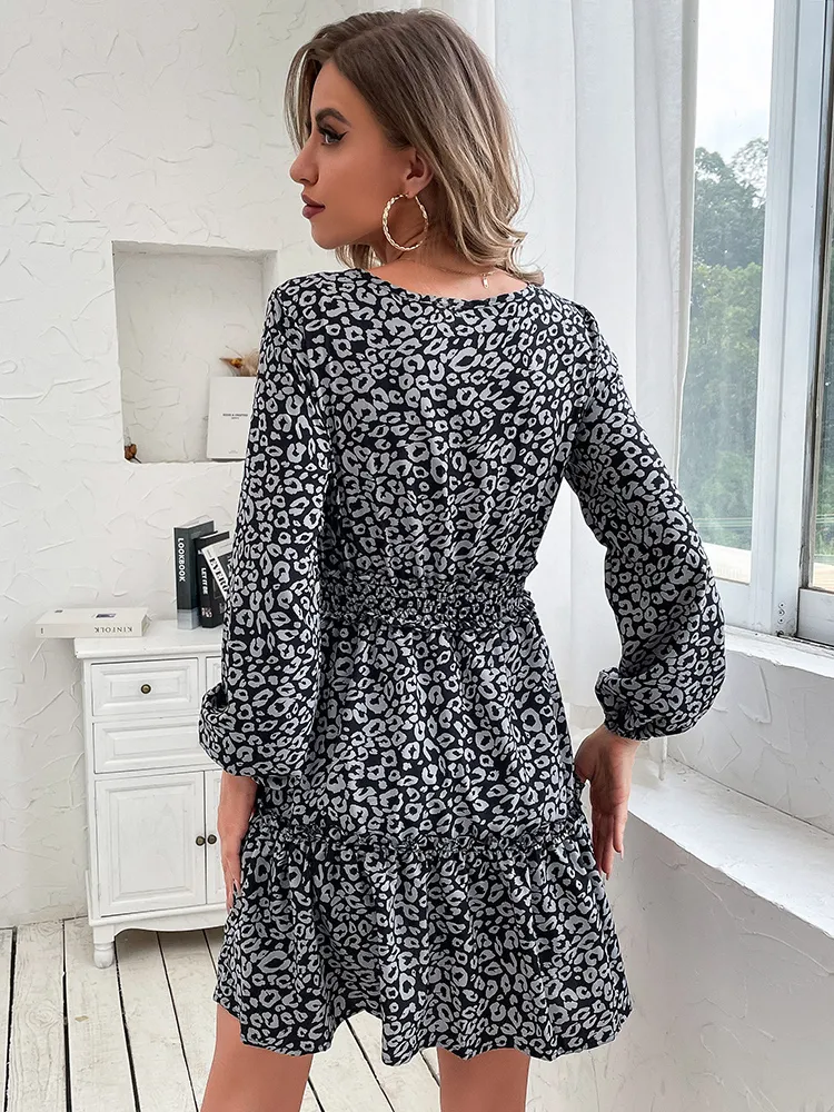 Elegant Long Sleeve V Neck Leopard Floral Print Pleated Mini Dress