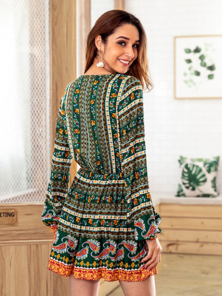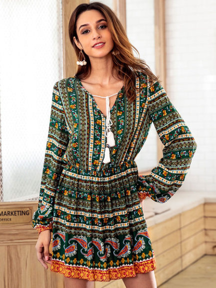 Long Sleeve Boho V Neck Tassels Printed Mini Dress