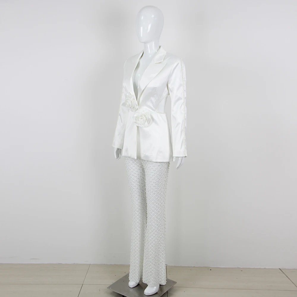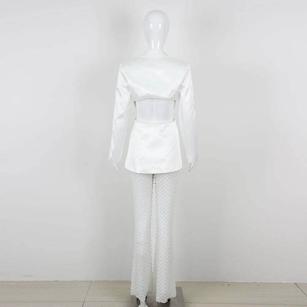 Luxury Long Sleeve V Neck Pearl Beading Pants Set Celebrity Designer Fashion Dress