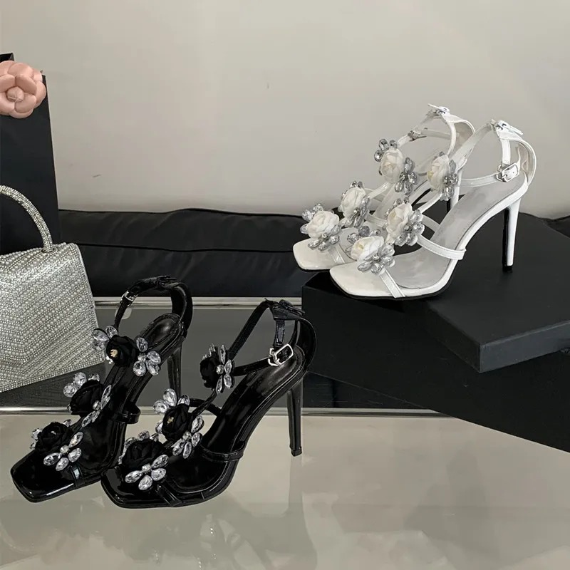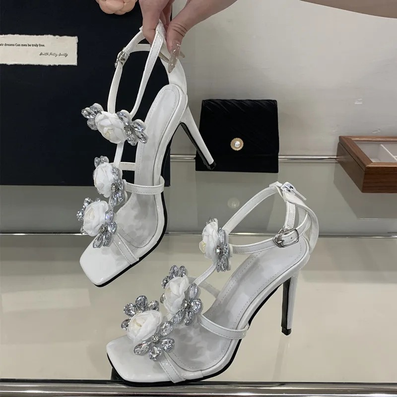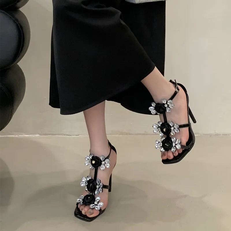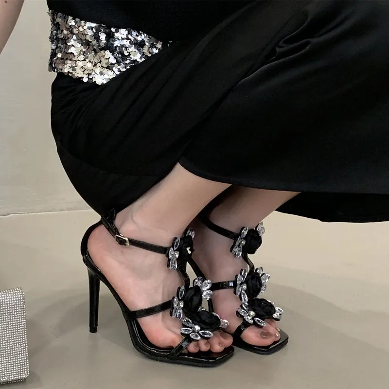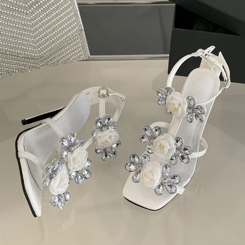 Luxury Rhinestones Flowers Buckle Strap Gladiator Narrow Band Sandals