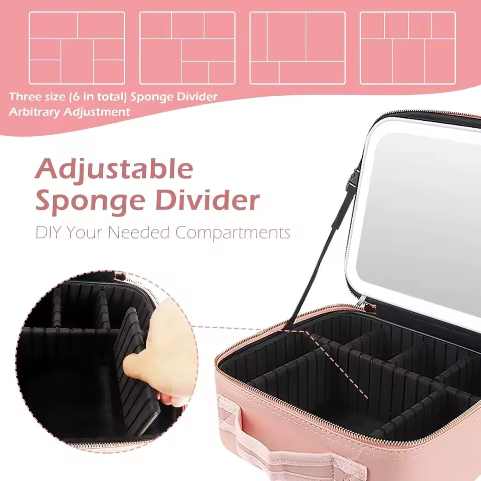 Makeup Bag With Mirror And Light Large Cosmetic Organizer Portable Storage With Adjustable Dividers