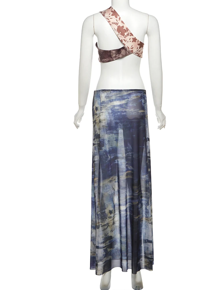 Metal Patchwork Irregular Hollow Print Backless High Splits Trend Wild Long Bodycon Dress