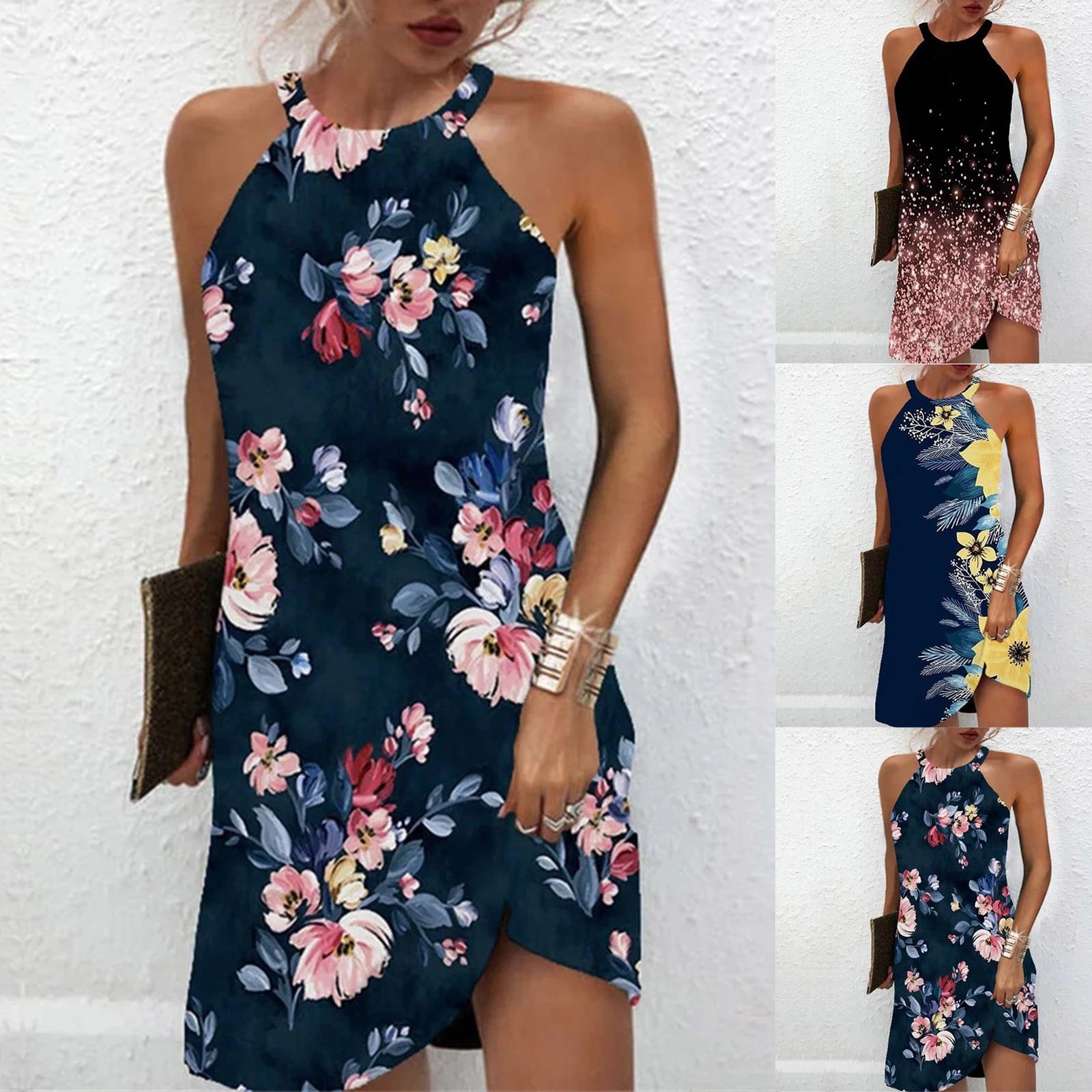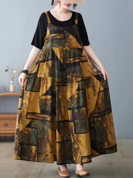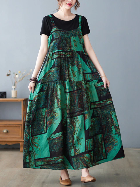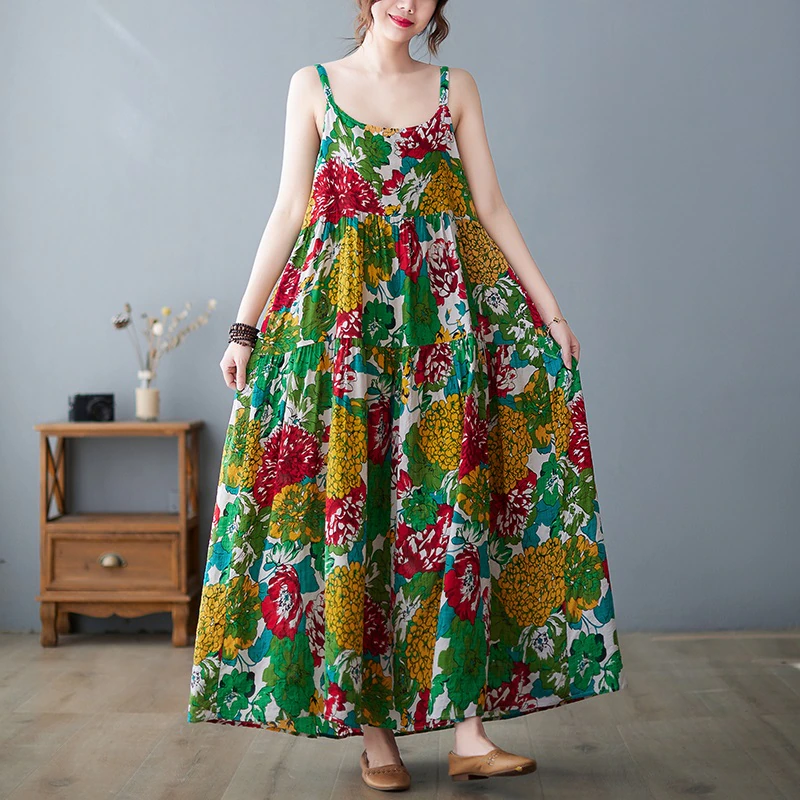 Sleeveless Strap Cotton Linen Vintage Floral Casual Loose Dresses