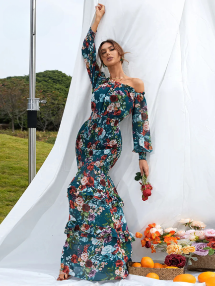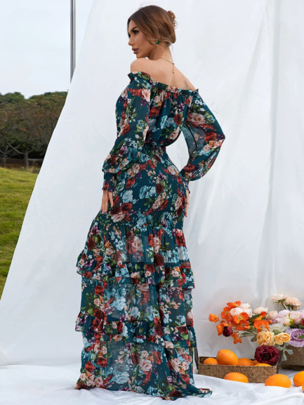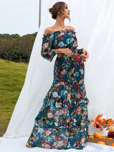 Off Shoulder Bishop Sleeve Shirred Ruffle Dress