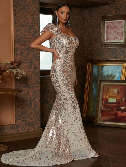 One Shoulder Golden Sequin Mermaid Hem Dress