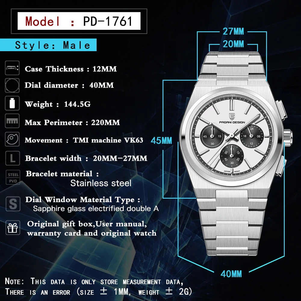 Stainless Steel Wrist Watch: Silver steel links, 220mm long and 20mm wide, with a folding safety clasp and push-to-open mechanism, the length can be adjusted by adding/removing. The diameter of the dial is 40mm and the thickness is 12mm. The sapphire crystal is second only to diamond in hardness, and the mirror surface is very wear-resistant.