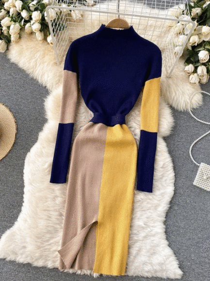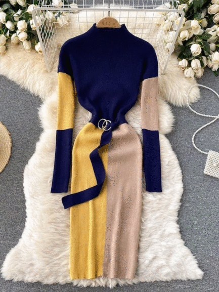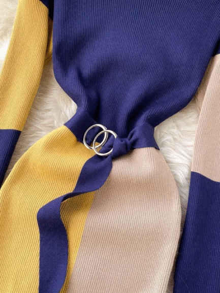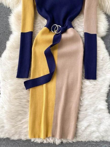 Patchwork Knitted Sweater Dress with Belt