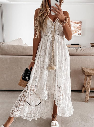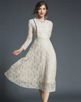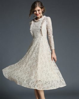 This is an elegant, figure-flattering peplum midi dress that is appropriate for any semi-formal occasion during the spring and summer seasons. The bodice is a fully-lined, bustier style with a deep, plunging neckline. Above that, is sheer black lace with a keyhole opening at the center. The same lace forms the close-fitting, three quarter length sleeves. The waistline is defined by a horizontal seam to which the peplum is attached. The peplum is short in front and tapers to below hip level in back. The skirt portion of the dress is pencil style and straight, with the hemline ending just below the knees. The dress closes in back with a long, hidden zipper.