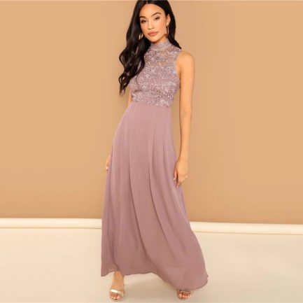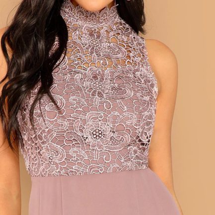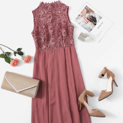 Be the first to review “Pink Guipure Lace Overlay Bodice Maxi Dress”