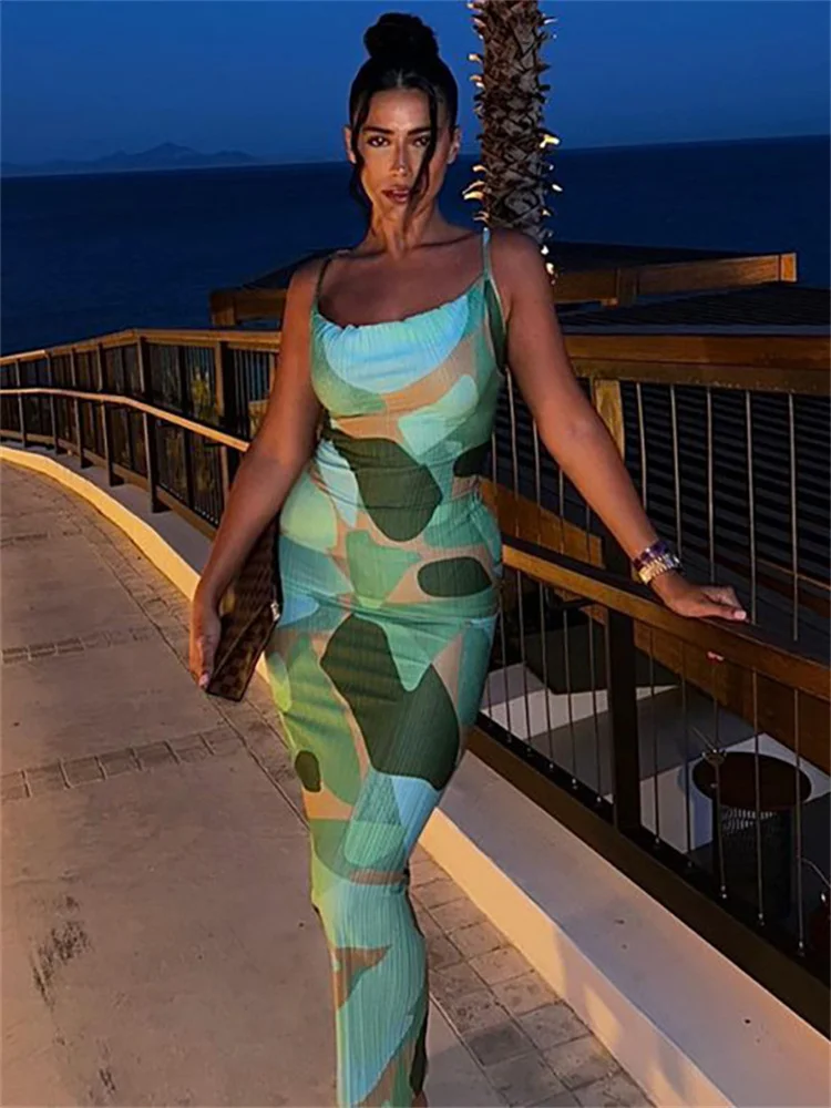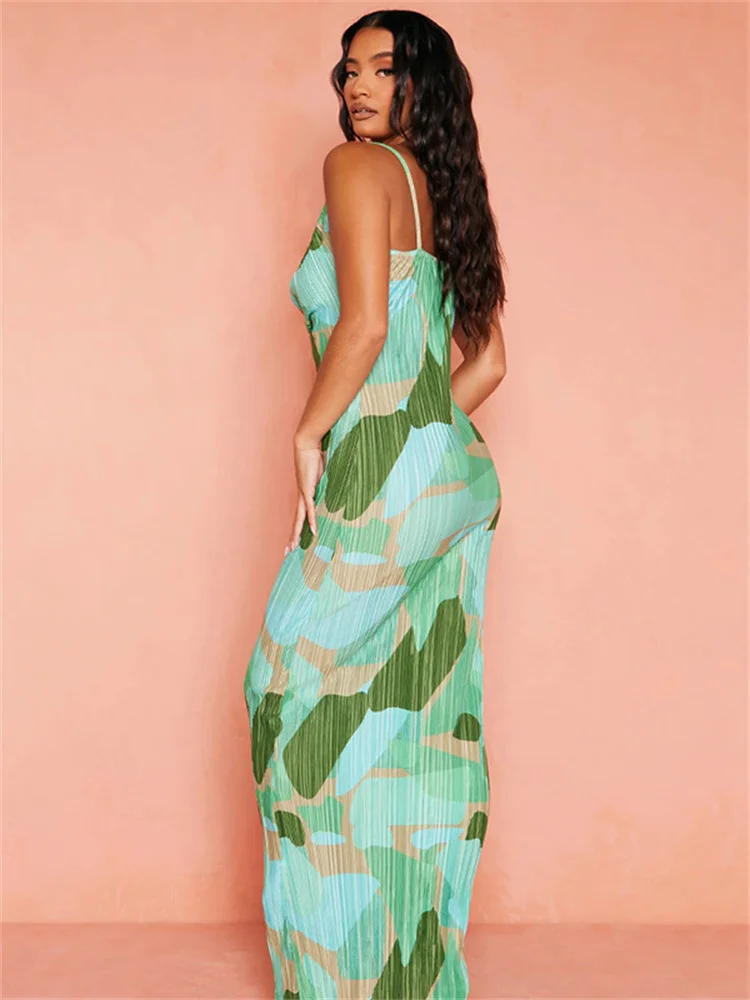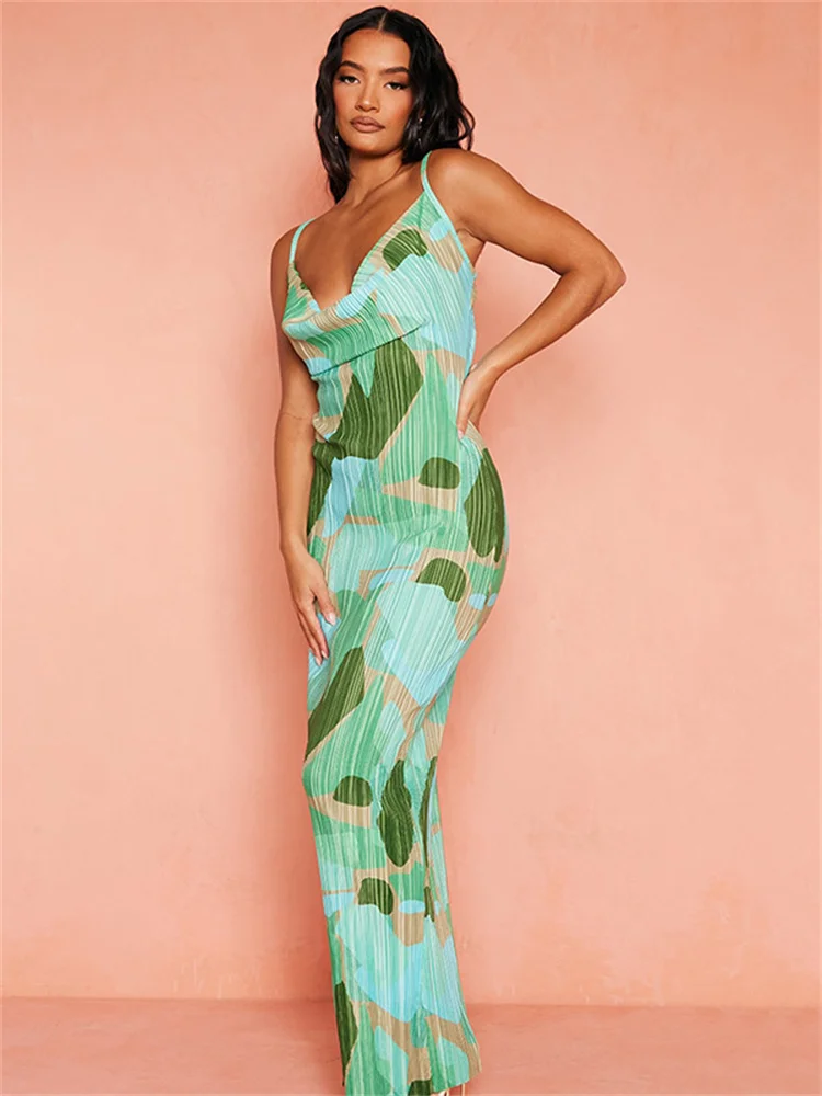Be the first to review “Pleated High Waist Spaghetti Strap Collar Print Slim Vintage Maxi Dresses”