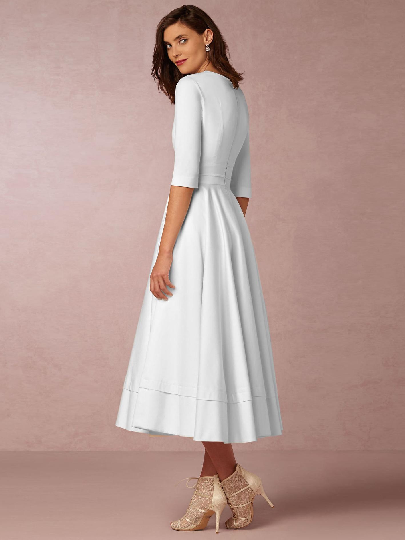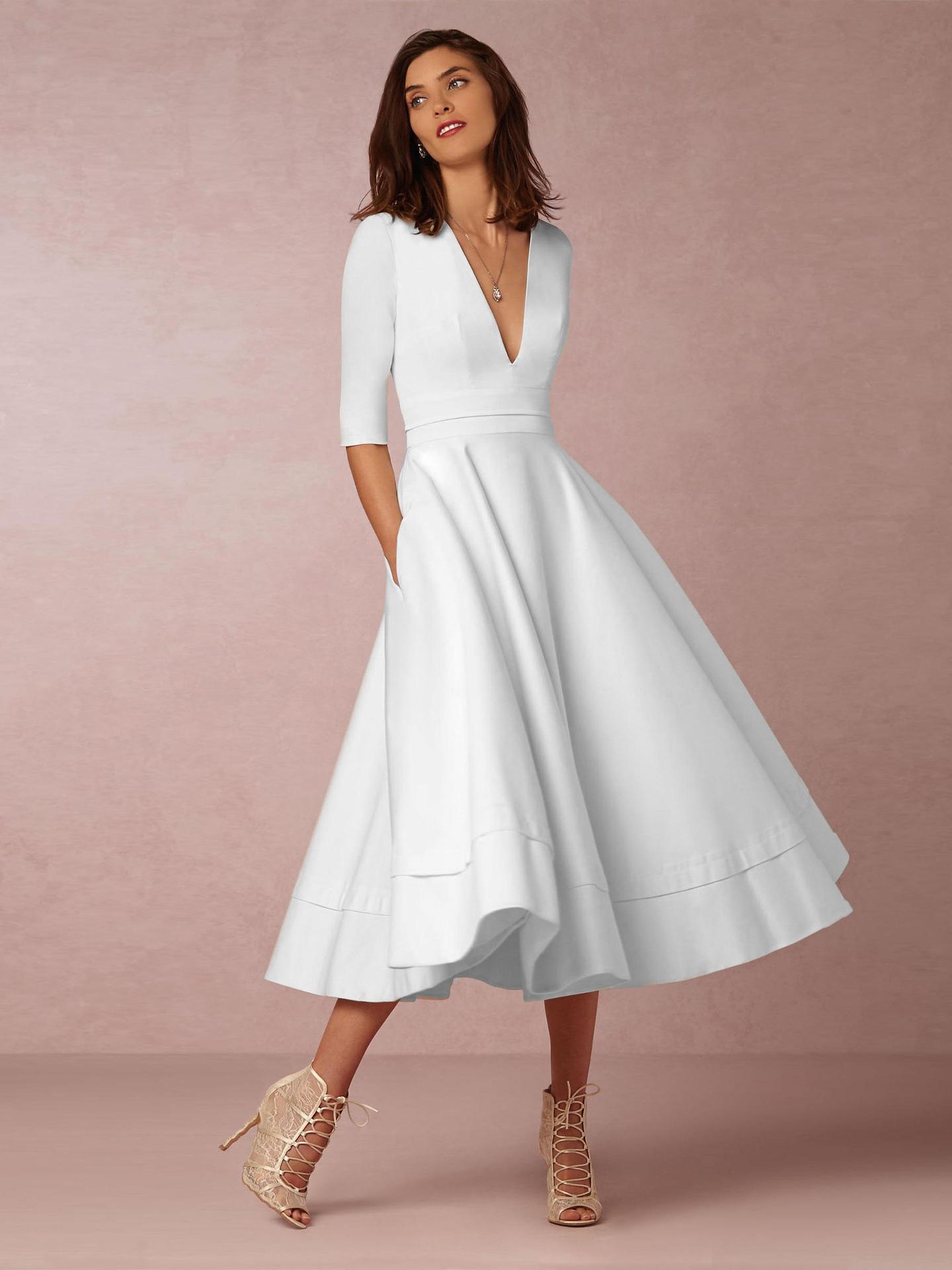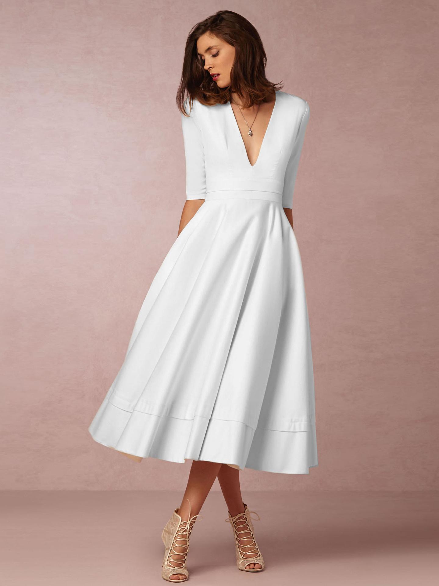 Plunge Midi Dress Half Sleeves Pockets A-Line Prom Dresses
