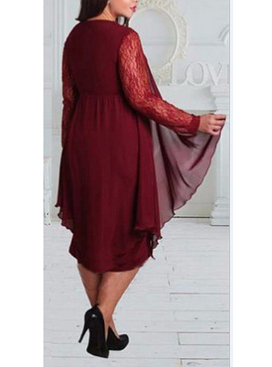 An exceptionally high quality chiffon forms an ethereal layer of womanly charm over this fully lined women’s chiffon midi dress. This is a midi length dress, with the hemline ending below the knees at the upper calf area. The dress closes in back with a long, hidden zipper. The bodice sports a deep vee neckline. The sleeves are full length, and are constructed from semi-sheer stretchy lace fabric. A draped layer of chiffon appears over the front of the dress to create the illusion of a separate wrap. It falls in folds on either side of the front, creating a figure flattering effect. This dress comes in a deep shade of Burgundy red.