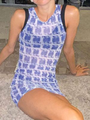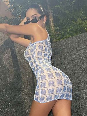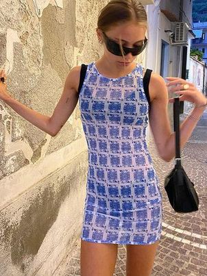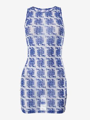 Printed Blue Jewel Neck Sheer Sleeveless Pencil Bodycon Dresses