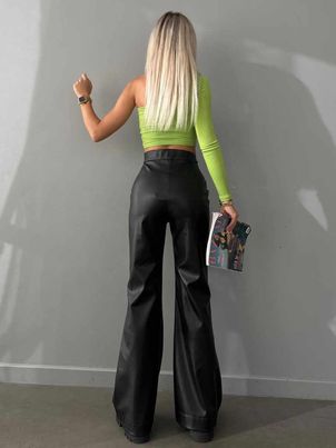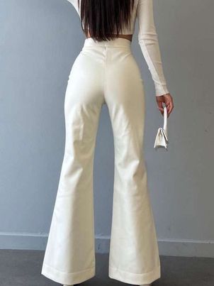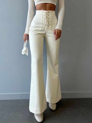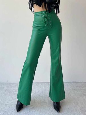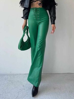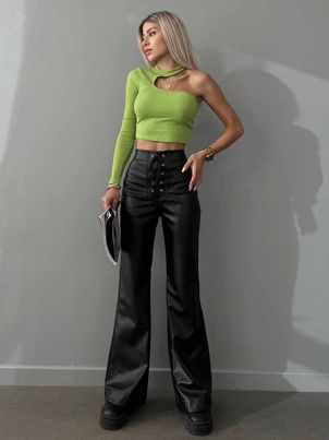 PU Leather Pants Drawstring Raised Waist Trousers For Women