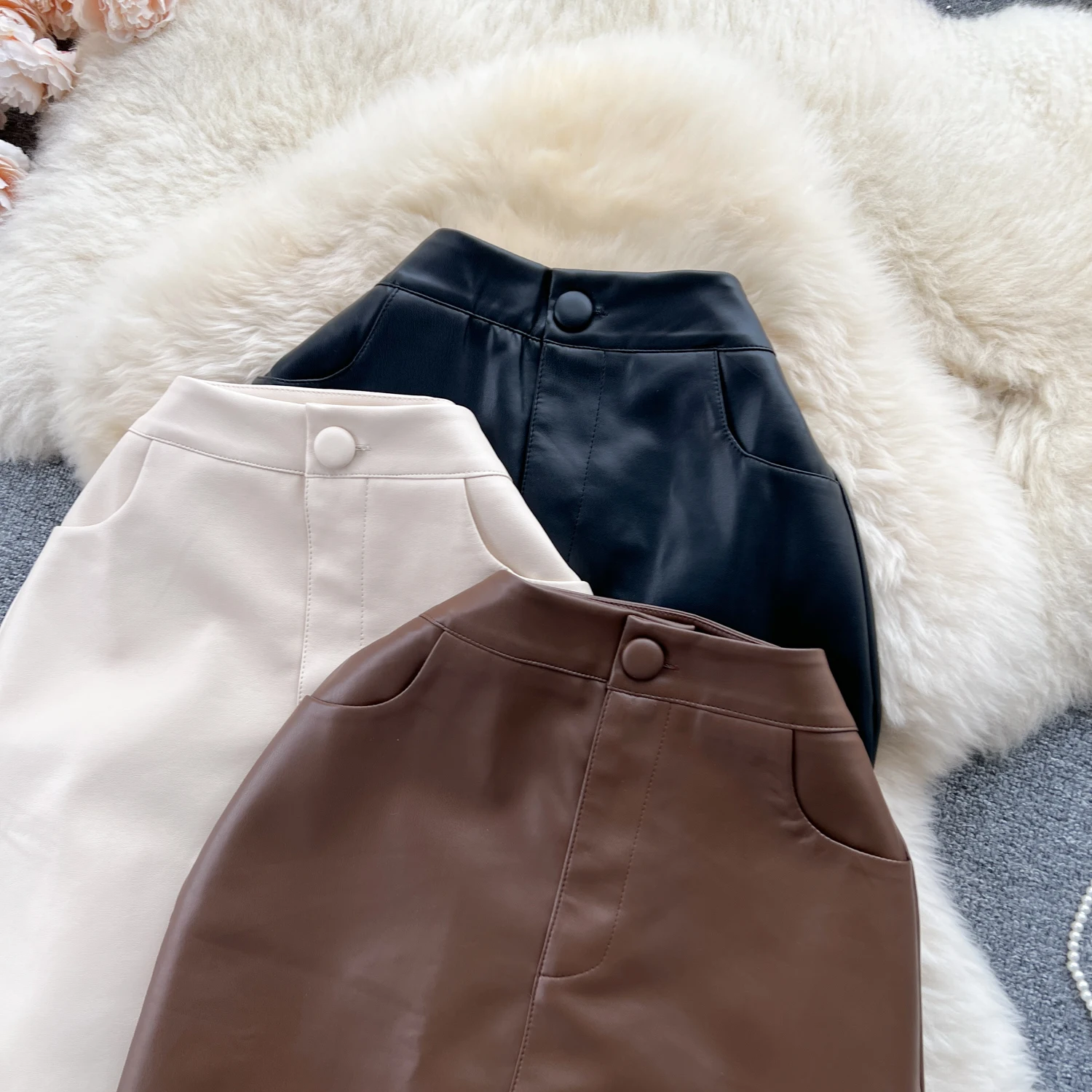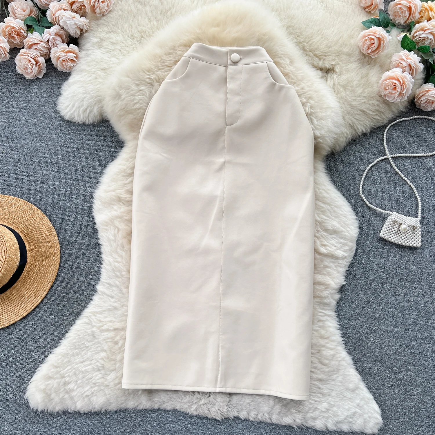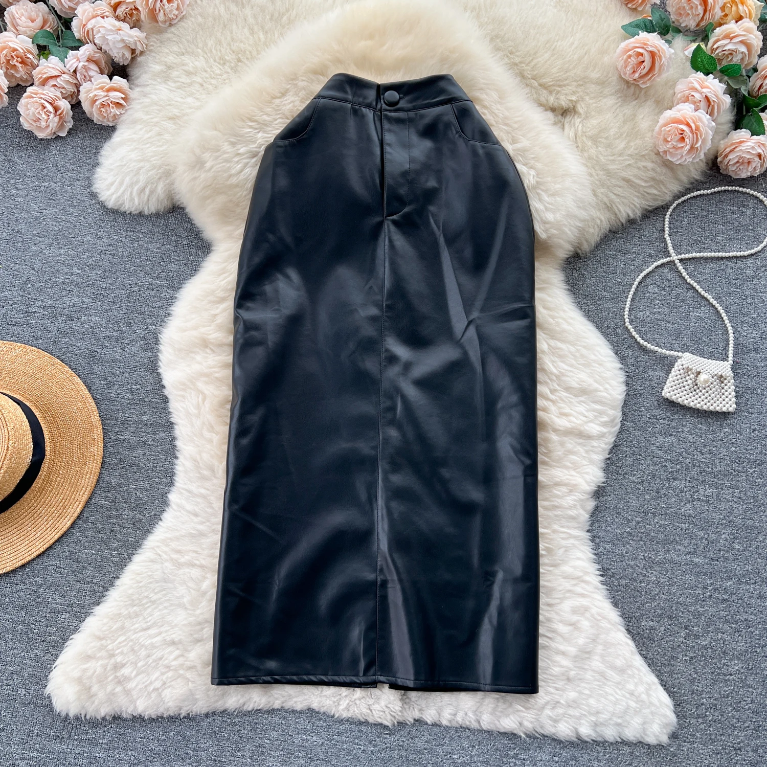 Pu Leather Retro Elegant Ladies Chic A-line Split Popular Midi Skirt