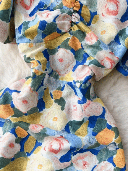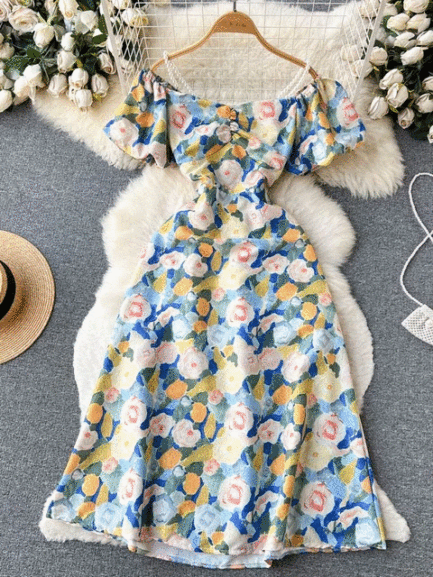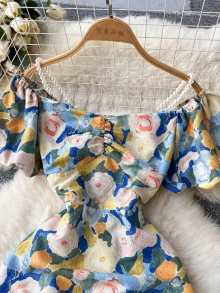 Puff Sleeve Pearl Straps High Waist Floral Dress