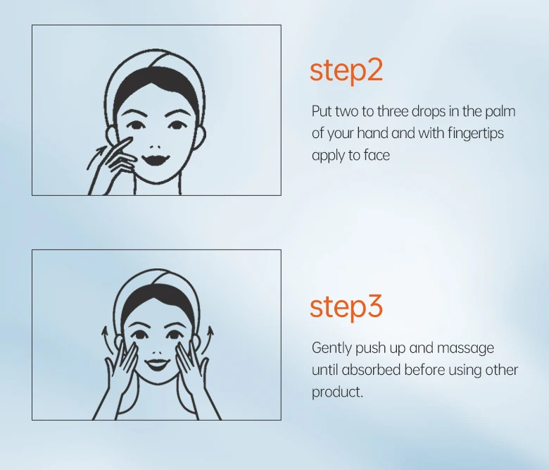 2. Put two to three drops in the palm of your hand and with fingertips apply to face