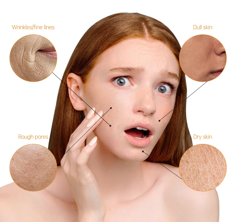 Many fine lines and wrinkles on the face, skin is dull/loose